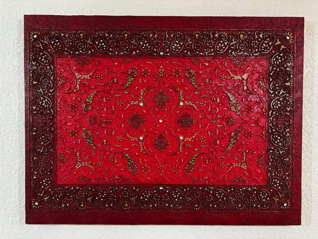 “This piece, with its vibrant colors, reflects the energy and life of the East. The Iranian carpet motif evokes tradition and heritage, while the colorful stones bring a new rhythm and light to the classic pattern.”