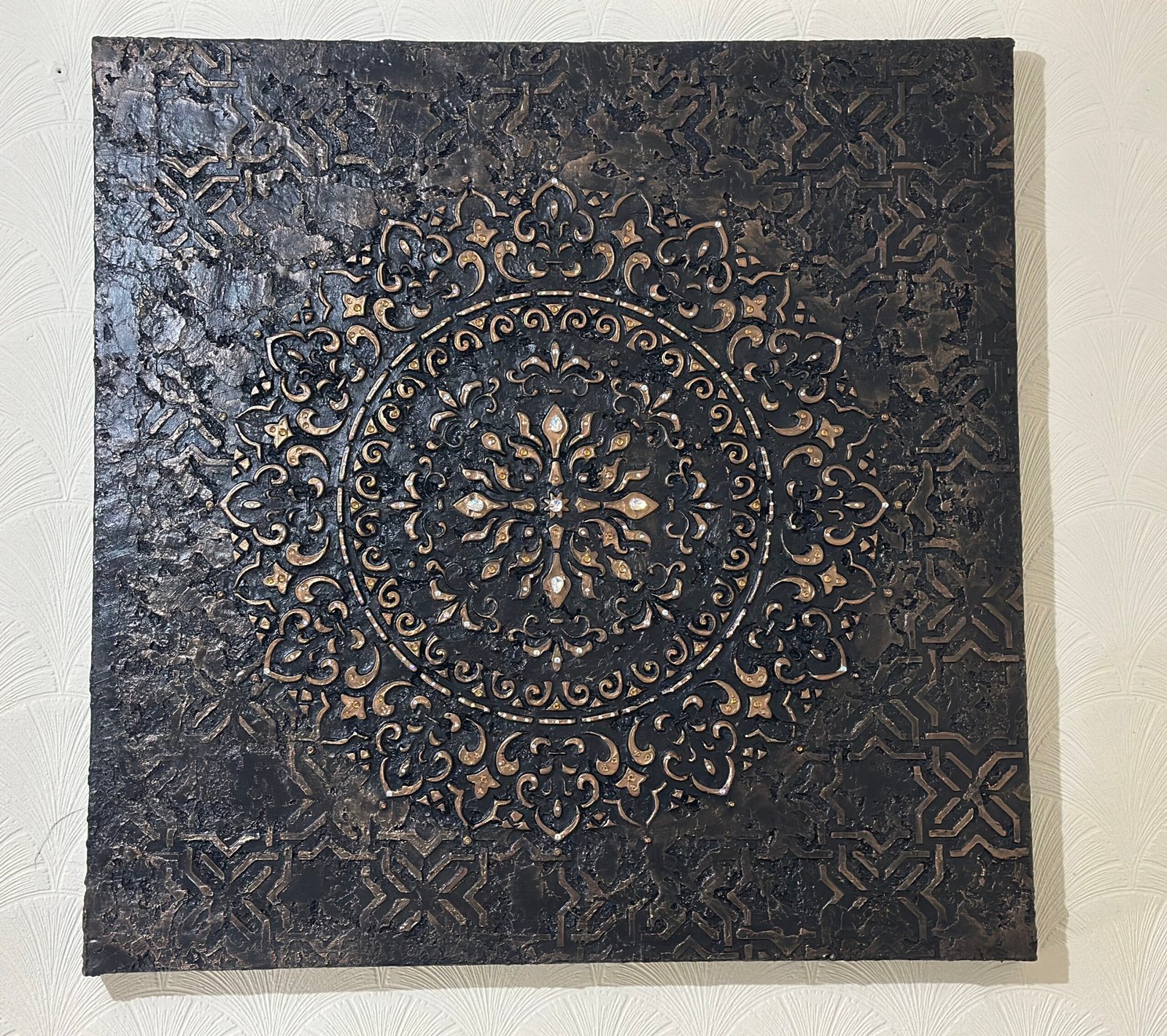 “This piece, with copper tones and seven-colored stones, reveals light and energy within darkness. The interplay of colors and the shimmer of the stones evokes a gentle rhythm of life and motion.”