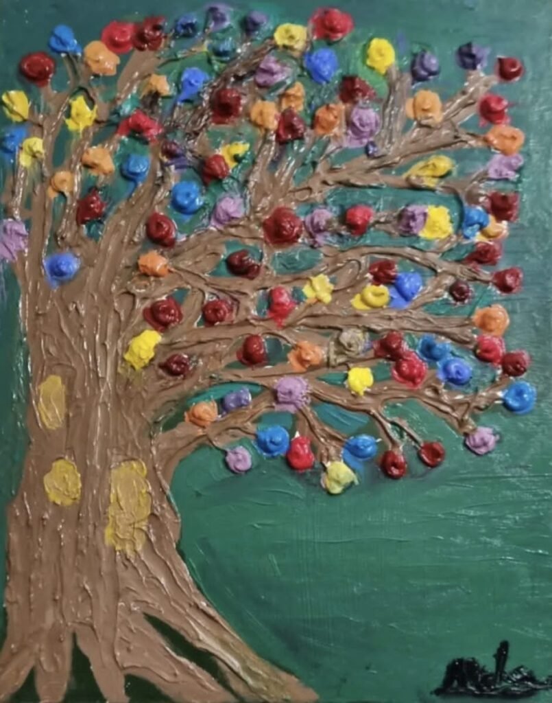 “MultiFlower3” presents a single tree overflowing with color and texture. The artist uses a heavy impasto technique, laying the oil paint thickly so that the trunk, branches, and blossoms rise physically from the surface. The rough, sculpted bark contrasts with the small, rounded dabs of pigment that become multicolored flowers – reds, yellows, blues, purples and oranges scattered like lights across the canopy.