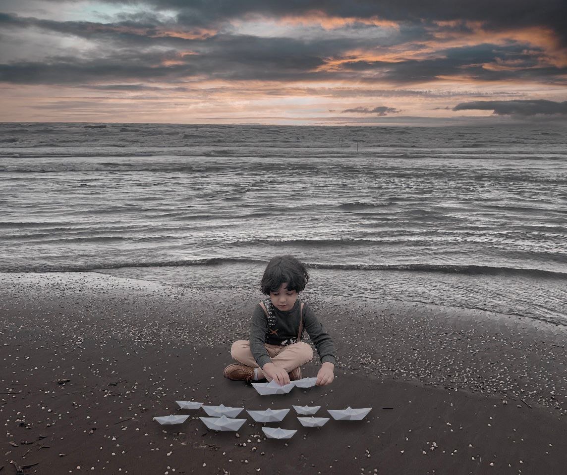 This artwork is best classified as Fine Art Conceptual Photography, created through photomontage. While the scene appears realistic at first glance, the intentional construction of elements—particularly the repetition of paper boats arranged before the child—moves the image beyond straightforward photography into a constructed, symbolic visual narrative.
