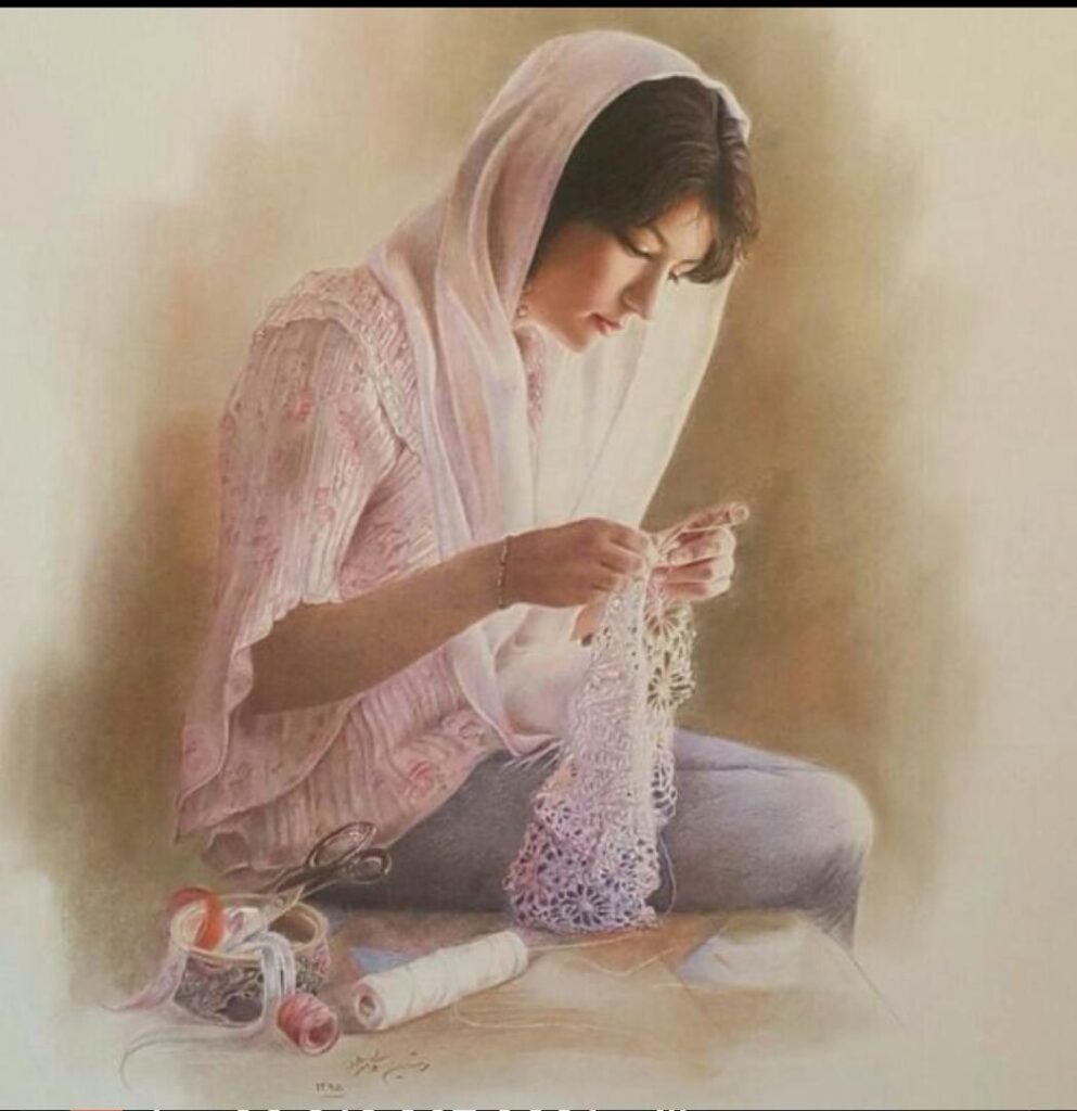 The woman’s posture, with her head slightly bowed and her hands steadily weaving fine threads, conveys introspection, patience, and a deep personal connection to her craft. Her translucent headscarf and the soft light bathing her profile emphasize purity and cultural rootedness. The lacework she is creating appears intricate and floral, symbolizing dreams, memory, and the interlacing rhythms of everyday life.