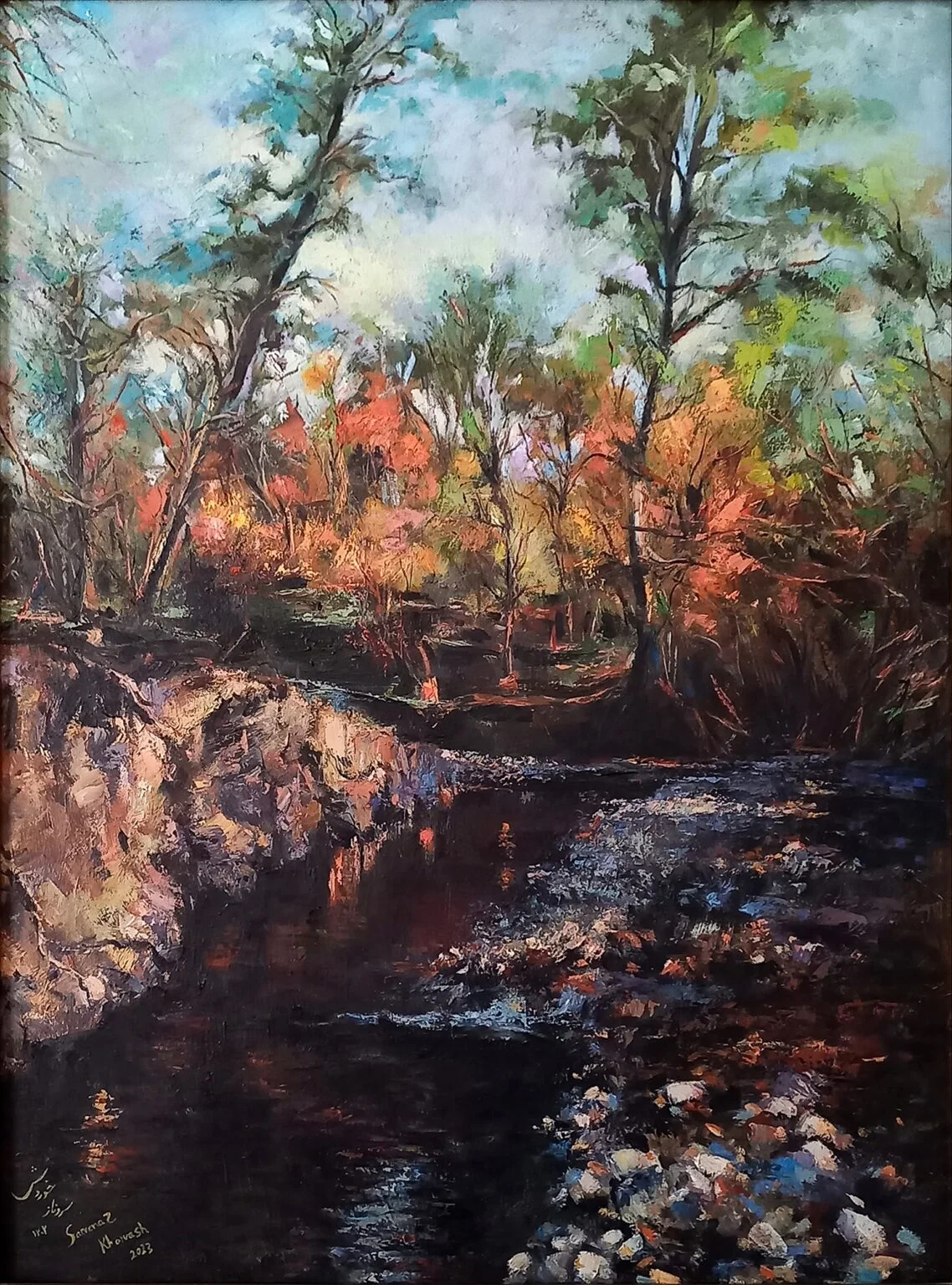 Lavij Village presents a serene and poetic interpretation of a natural landscape, most likely inspired by the mountainous forest region of Lavij in northern Iran. The composition is dominated by a flowing stream that cuts through the scene, guiding the viewer’s eye from the darker, textural foreground toward the luminous mid-distance. This stream functions as both a visual anchor and a symbolic conduit, suggesting motion, reflection, and the continuity of life.